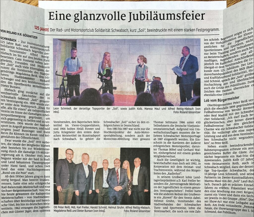 Neben ein paar Ansprachen unseres 1. Vorstands Alfred Rettig-Hiebsch, von Oberbürgermeister der Stadt Schwabach, Peter Reiss, dem Stadtverbandsvorsitzenden Helmut Gruhn, Landtagsabgeordneten Karl Freller und Harald Schmidt, unserem Präsidenten des RKB, gab es noch einige sportliche Darbietungen.